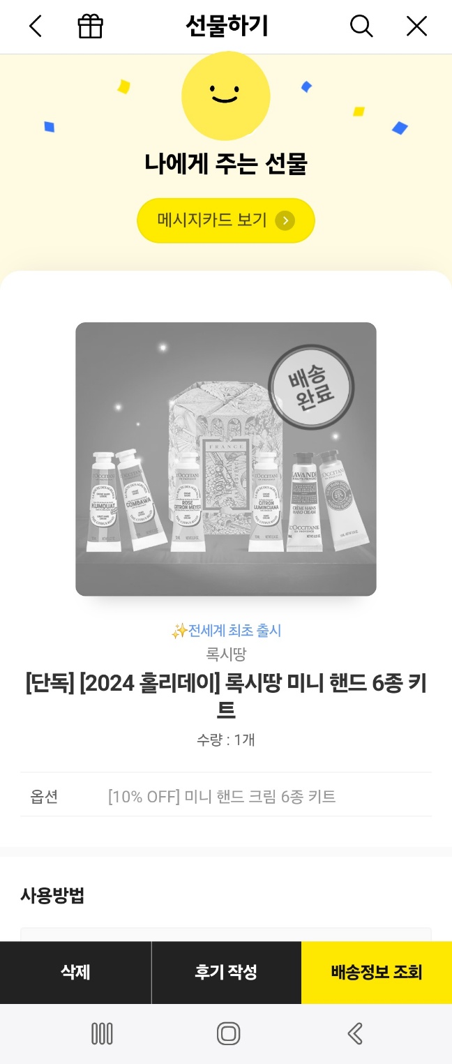 우리나라에 단독 출시했다는 록시땅 미니 핸드 6종 키트 2024 홀리데이 버전 언박싱입니다. 카카오톡 쇼핑에서만 판매하고 있나봐요.저도 카카오톡 선물하기에서 나에게 선물하기를 했답니다.