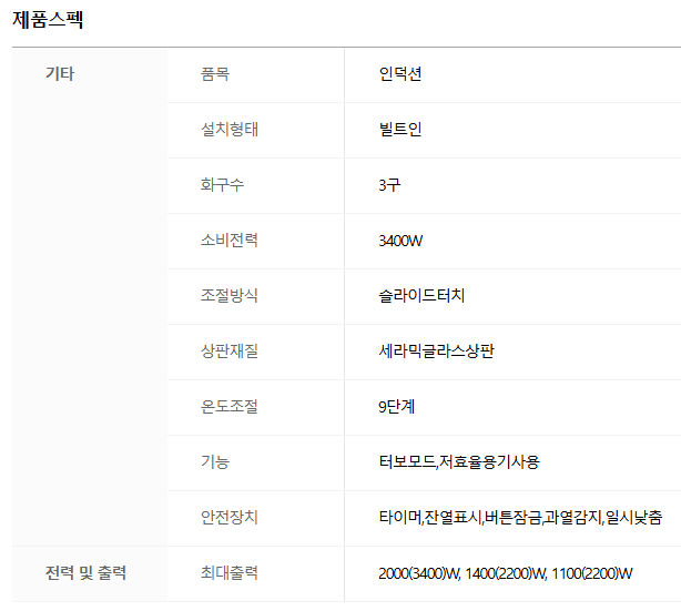 인덕션 화구를 여러개 동시에 사용할 때 총 전기출력량이 3400W를 넘으면 차단기가 내려갈 수 있습니다.