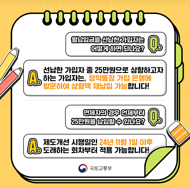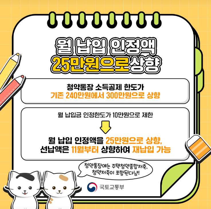 2024년 11월 1일부터 주택청약 월 납입 한도가 기존 10만원에서 25만원으로 상향 조정됩니다.