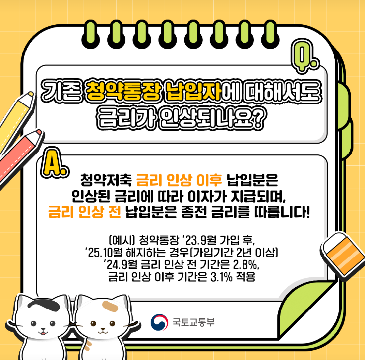 기존 2.8%에서 3.1%로 금리를 인상합니다. 기존 청약통장 가입자는 금리 인상 이후 납입분부터 인상된 금리를 적용받습니다.