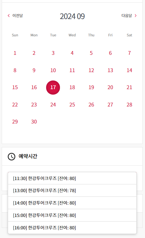 예약페이지로 가시면 예약 가능한 날짜가 빨간색으로 표시되고 날짜를 클릭하시면 그날 운영하는 시간과 잔여좌석이 뜹니다. 시간을 클릭하시고 예약자 정보를 입력하고 결제하시면 됩니다.