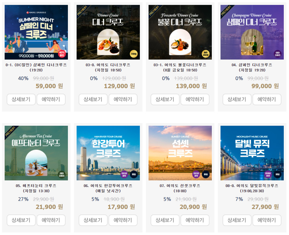 한강유람선은 아래와 같이 16개의 테마 상품이 있습니다. 원하시는 테마와 시간에 맞게 선택하실 수 있습니다.