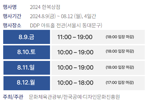 2024 한복상점이 동대문 DDP 아트홀에서 8월 9일 ~ 8월 12일 4일 동안 열립니다. 사전등록을 하면 무료로 관람 가능합니다. 사전등록 가긴은 8월 8일까지예요. 서두르세요! 그리고 행사장에 한복을 입고 가셔도 무료입장이며 현장 발권은 5,000원이네요. 한복 이외에도 원단, 아이 옷, 각종 소품 등 우리나라의 전통미를 마음껏 향유할 수 있습니다.