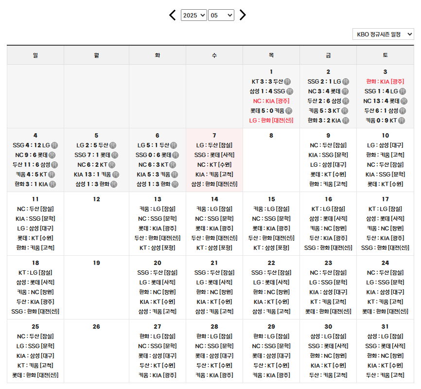 2025년 5월 프로야구 일정