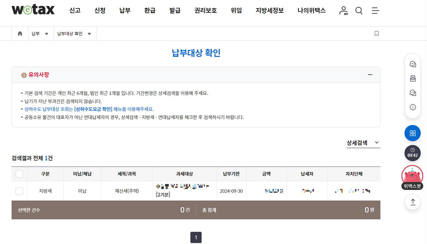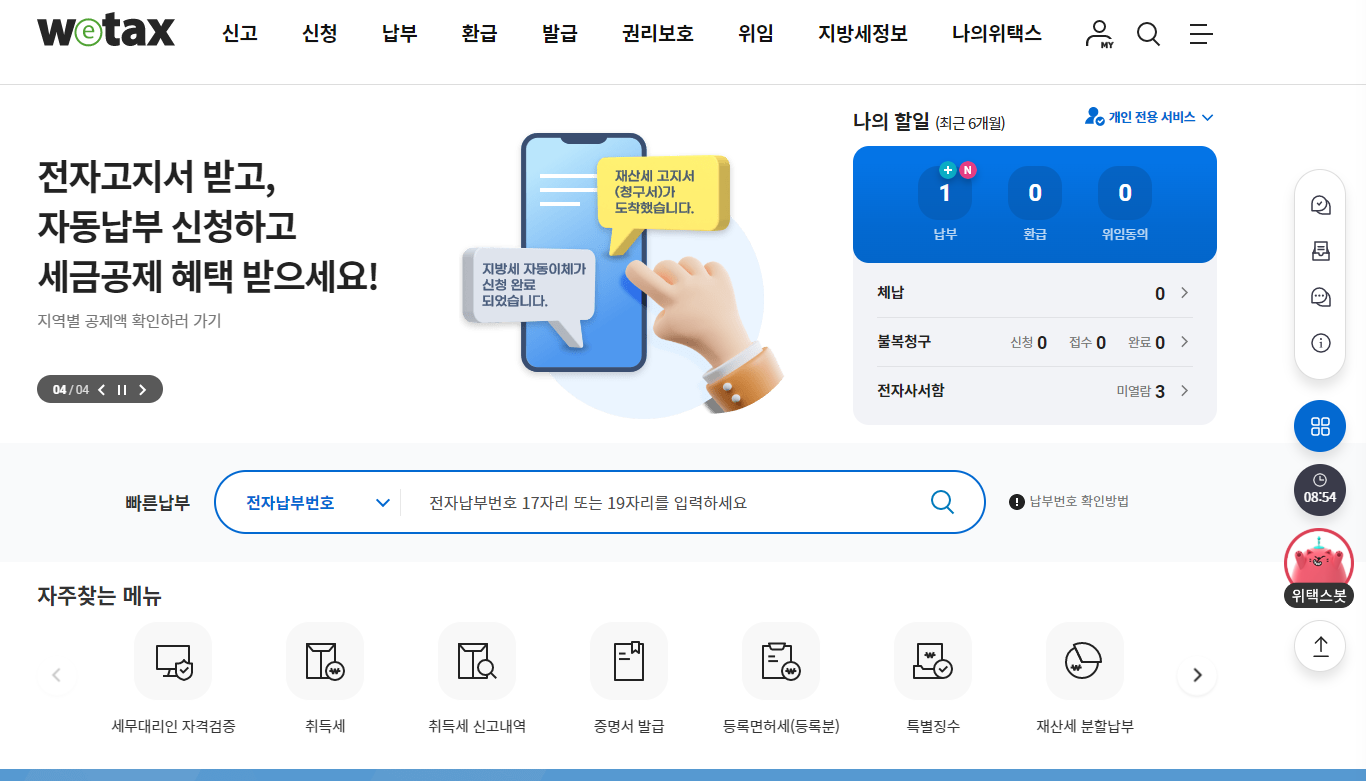 재산세는 위택스에서 조회할 수 있습니다. 회원가입 후 로그인을 하면 초기화면에 직관적으로 중요정보가 표시됩니다.