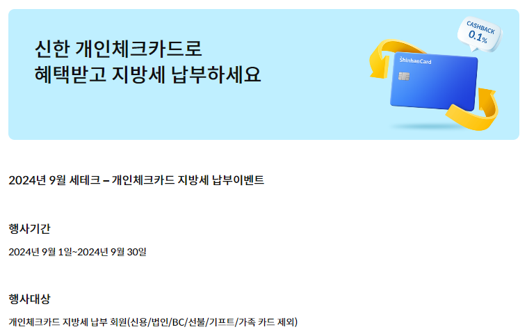 혜택 : 납부 금액의 0.1% 현금캐시백 (10만원 납부 시 1만원 캐시백)
